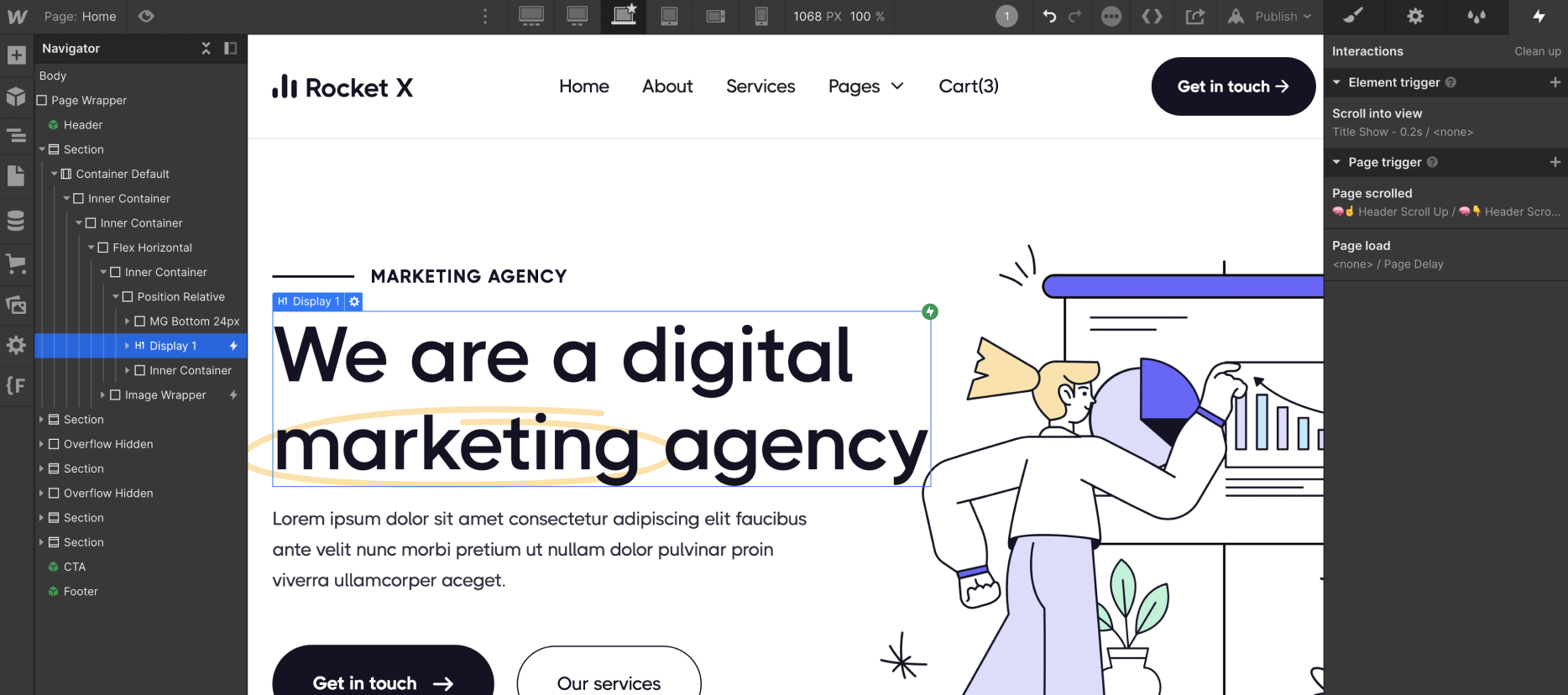If you would like to edit any template Interaction (i.e. removing a appear effect), you can easily identify elements that have interactions as these have a small Interactions icon (a small thunder) in the left sidebar Navigator.